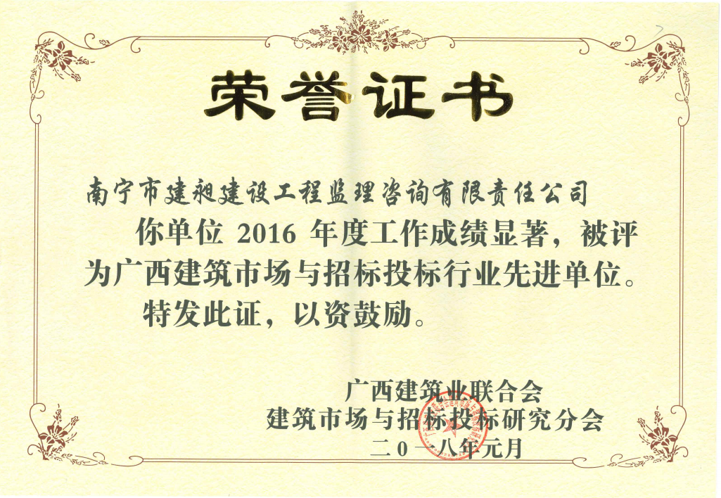 熱烈祝賀我公司再次榮獲“廣西建筑市場與招標(biāo)投標(biāo)行業(yè)先進單位”榮譽稱號,從2011年起已連續(xù)6年榮獲此殊榮。同時還有3位同志榮獲“廣西招標(biāo)投標(biāo)代理機構(gòu)先進個人”稱號,向他們表示祝賀。