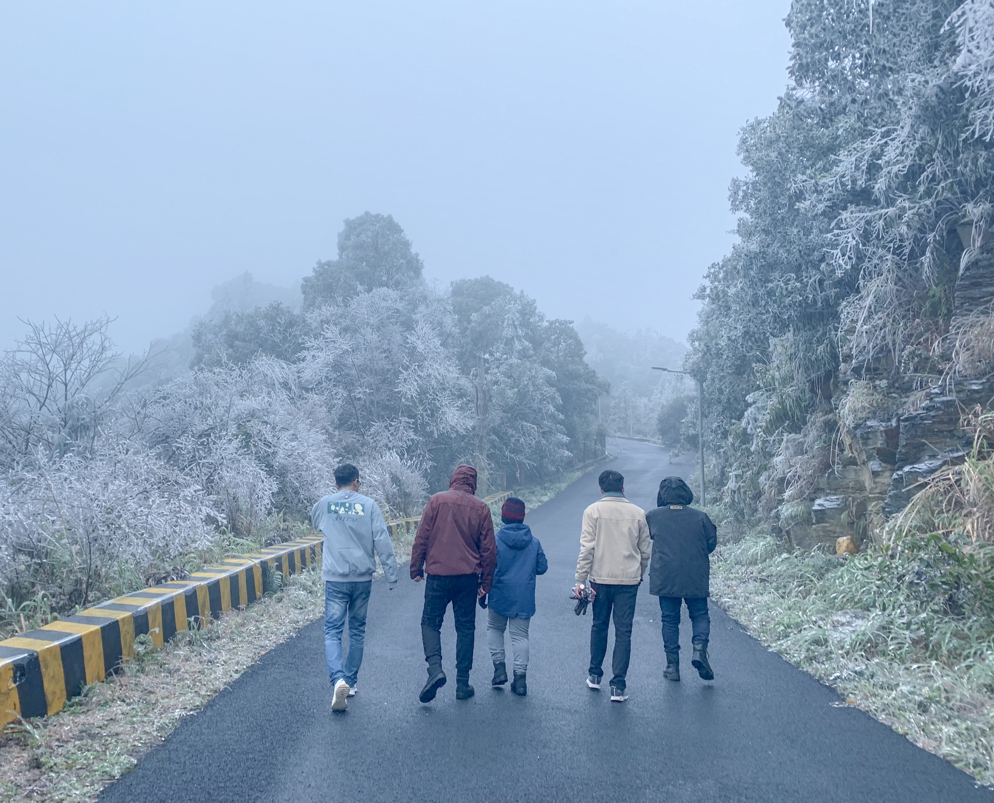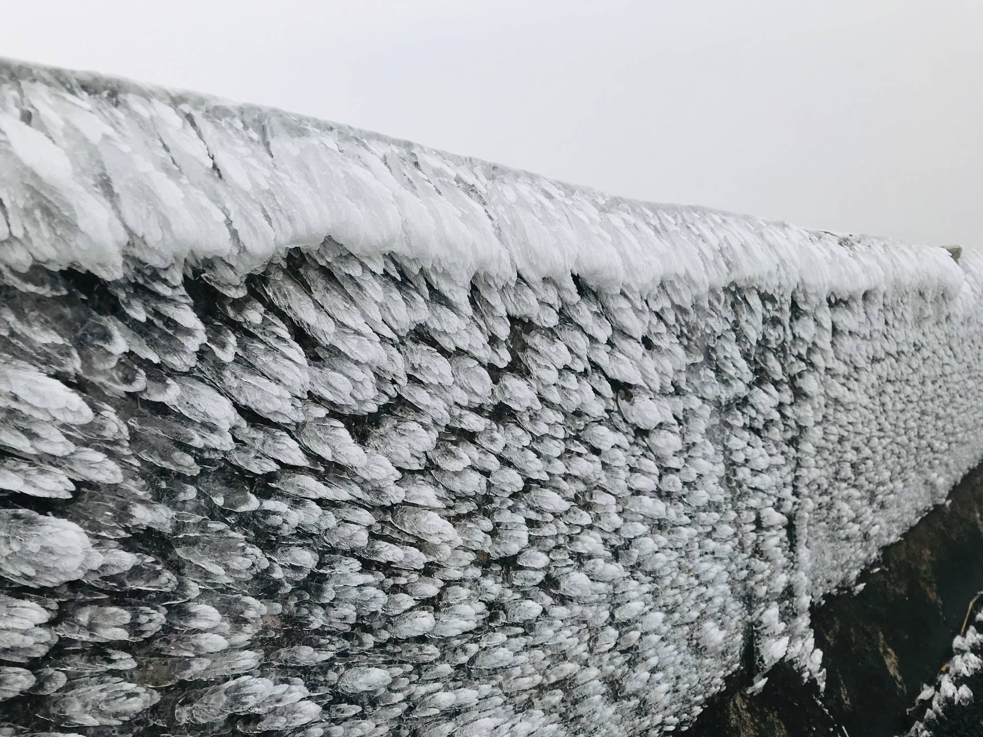 我們上山的前夜,南寧氣溫驟降,但沒有雨,而霧凇需要溫度、濕度、風力、風向等諸多條件適宜、合理匹配時才能生成,能不能看到霧凇也成了一大懸念。29日下午一行人來到大明山腳下,天空放晴,眾人懷著好奇心一路直上,越往上,霧越大,氣溫越低,窗外已然白茫茫的一片,待到觀景點停車時,剛下車,狂風呼呼直灌進身體里,不時傳來驚呼聲,各人忙著用手機拍拍拍,可沒過一會,就有不少人驚覺手機已被凍停關機。另一處景點更是霧大風大,能見度不足10米,暴露在外的頭發(fā)、眉毛很快掛上冰花,堅持不到5分鐘紛紛上車。到了山上,匆匆把行李一放,便三五成群與大自然的杰作合影,手機鏡頭對著的美景,或婀娜多姿,或一塵不染,妖嬈迷人,美不勝收。